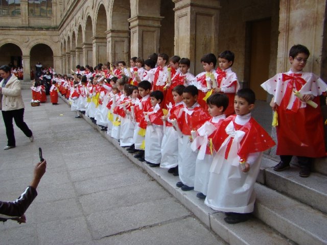 Así los niños de 3 a 5 años de segundo ciclo de infantil se disfrazaron de monaguillos, disfraces que se habían estado confeccionando en las clases con la ayuda de los padres y madres los días anteriores. Compañía no les faltó con sus profes vestidos de curas y de monjas. Complementando este disfraz, realizaron una preciosa coreografía al son de la canción de la banda sonora de “Sister Act”, “I will follow Him”.