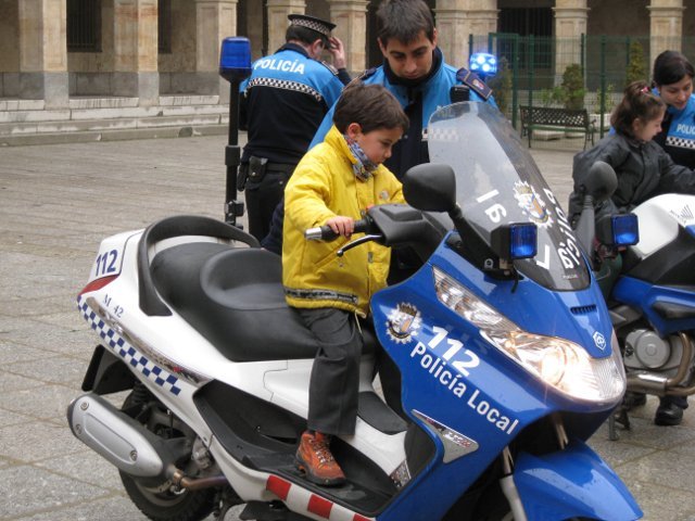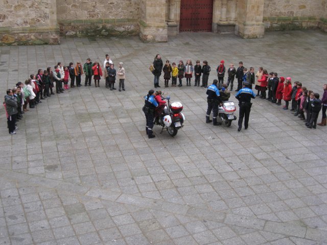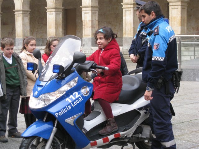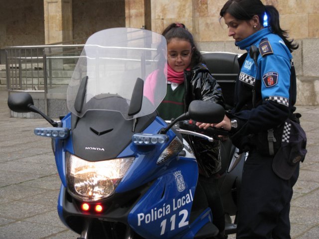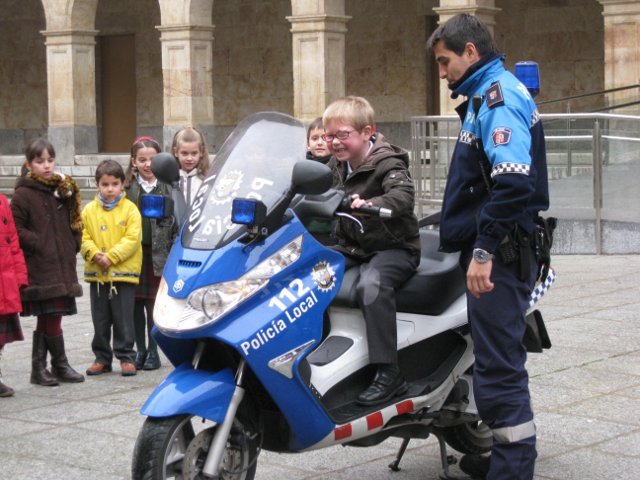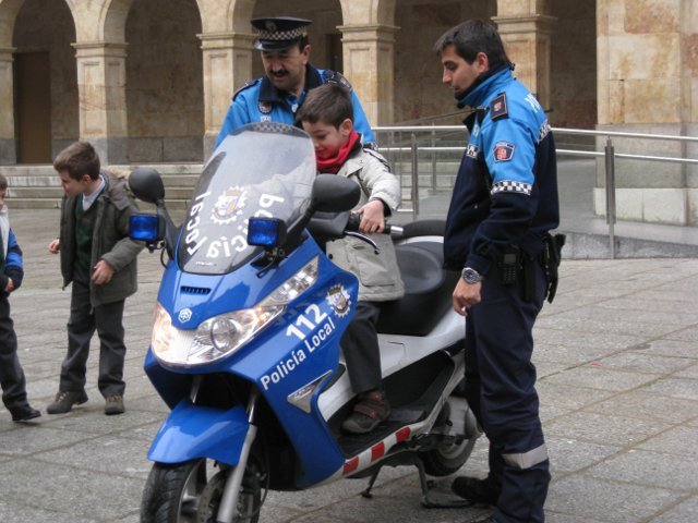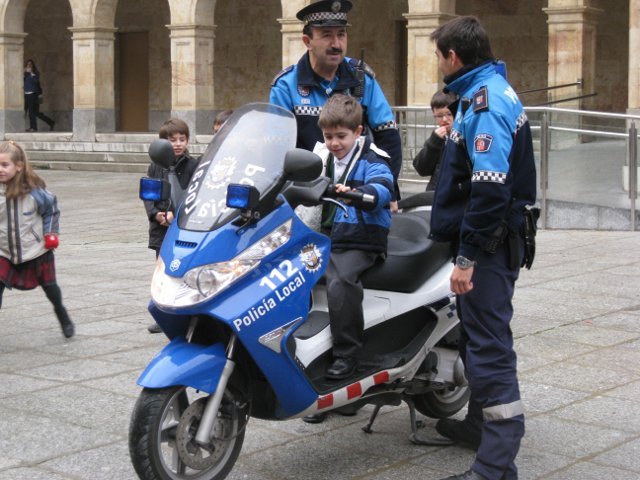 El lunes día 18 de enero vinieron agentes de la Policía Local de Salamanca a dar unas nociones básicas de educación vial a los niños de 2º de primaria y a acercar el oficio de policía municipal a los escolares. Para terminar la visita estuvieron enseñándoles a los alumnos las motos que utilizan para realizar sus servicios. Los críos disfrutaron subiéndose en las motos haciendo sonar la sirena y tocando el cláxon.