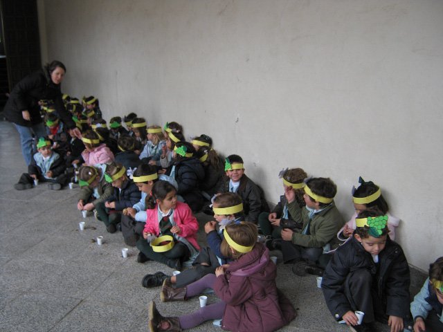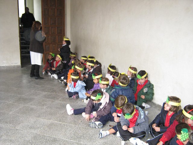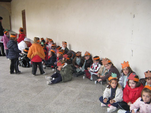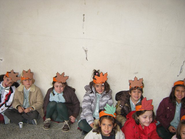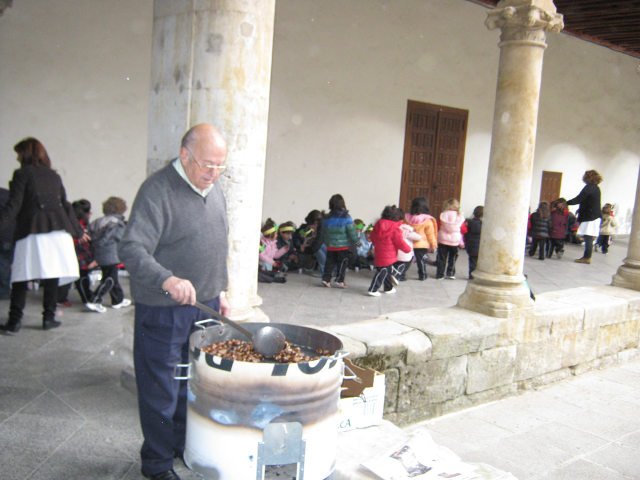 En las clases confeccionamos unas coronas con frutos típicos del otoño y, ataviadas con ellas, salimos al claustro (patio del pino) donde el Padre Julián ya nos estaba esperando con las castañas recién asadas.