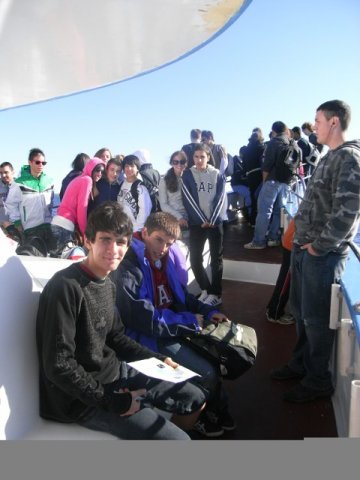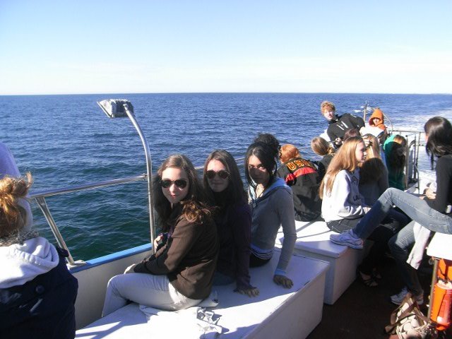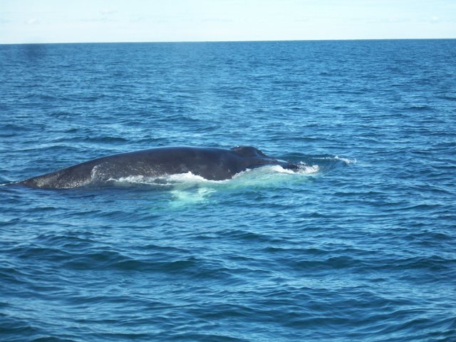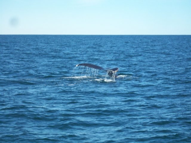 La última excursión de la semana nos llevó mar adentro en búsqueda de ballenas. Hizo un día maravilloso, soleado y sin demasiado oleaje. Vimos de lejos ‘a Fin Whale’ (tan largo como dos autobuses juntos y más bien delgado) ‘blowing’ or ‘spouting’ (respirando/echando la sal) pero no quiso dejarnos acercarnos. También vimos un ‘Minke Whale (de entre 7 a 9 metros de largo) varias veces. A la vuelta tuvimos más éxito y pudimos ver durante un buen rato a un Humpback Whale (ballena jorobada) sumergiéndose para alimentarse y volviendo a subir a la superficie.