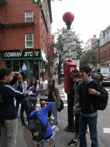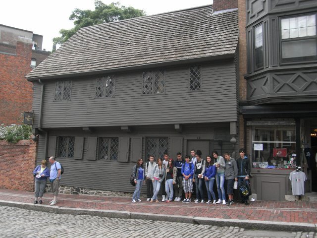 Seguimos aprendiendo más sobre la historia de EEUU y de Boston andando parte del Freedom Trail (Camino de la Libertad). Esta línea roja dibujada en la acera indica la ruta a seguir para pasar por los sitios y edificios con más interés histórico y turístico de la ciudad. Empezamos en Old North Church, construida en 1723. Es la iglesia más antigua de la ciudad y jugó un papel importante en la víspera de la Guerra de Independencia, ya que se usó por parte de los ‘patriots’ para comunicar, utilizando linternas, que los ingleses se acercaban por mar y no por tierra, dándoles tiempo a los patriotas a reunir y organizarse en su lucha contra los soldados ingleses. Detrás de la iglesia, se encuentra un monumento sencillo pero llamativo: colgados de unas cuerdas hay una placa de identificación (dog tag) por cada persona muerta en Iraq y Afganistán. Más historia sobre la Guerra de Independencia nos espera con la estatua de Paul Revere (a patriot) y más adelante su casa (construida en 1680) a puro estilo casa colonial –  estilo típico de las casas de esta zona de EEUU aun hoy día. The North End es el barrio de los Italianos así que paseamos viendo los escaparates de tiendas, restaurantes italianas…  [Esa misma mañana pasamos en autobús por el barrio chino donde hasta los letreros de los McDonald’s aparecen en chino!!] Parada obligada en lo que se considera la mejor pastelería italiana del barrio! El último monumento que vimos consiste en unas torres cuadradas hechas de cristal, cada una de las cuales representa uno de los campos de concentración alemanes de la 2ª Guerra Mundial y lleva grabados los números de identificación de la gente que murió en ello. Impactantes!