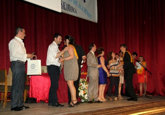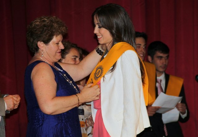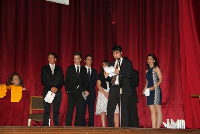 La graduación llegaba a su fin con la imposición de bandas de mano de las tutoras de 2º Bachillerato. Los chicos desfilaron por el escenario, hubo risas, abrazos y se dejo ver alguna lagrimilla.