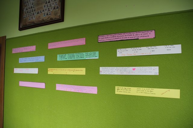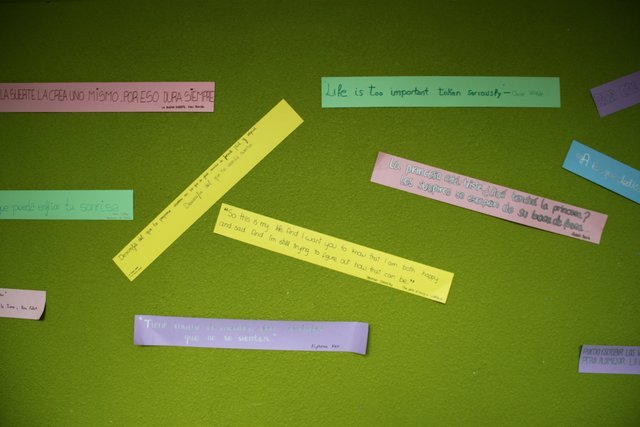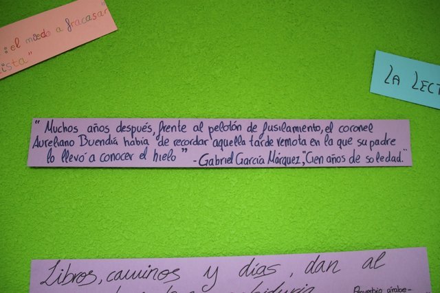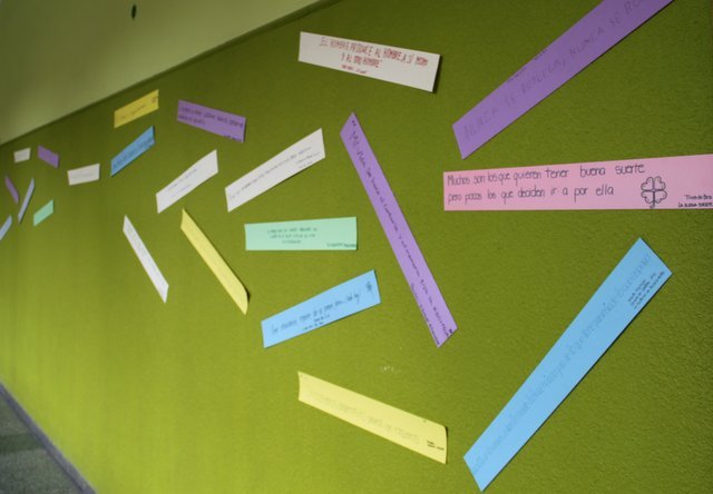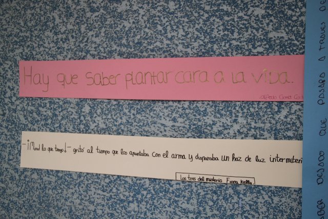 La dinámica ha tenido gran aceptación, cada alumno debía poner en una cartulina una frase de un libro que le resultara llamativa, junto con el título y el autor.