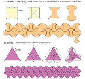 «El arte islámico es muy rico en diseños geométricos. Entre estos, los árabes decoraron sus palacios con una gran variedad de ornamentos construidos a partir de figuras geométricas mediante su repetición y acoplamiento. Este arte islámico tiene su mayor exponente en la Alhambra de Granada. Dos ejemplos de estos mosaicos son el polihueso y la pajarita.»