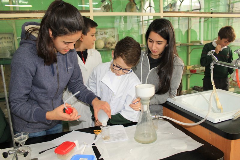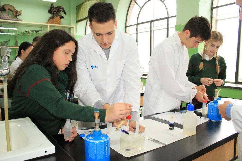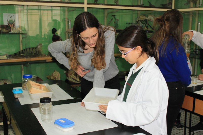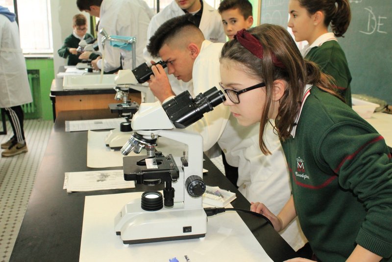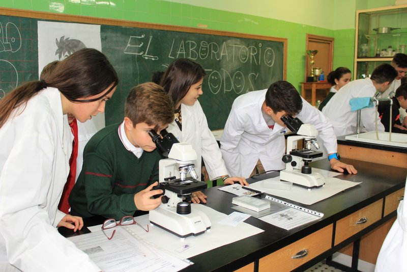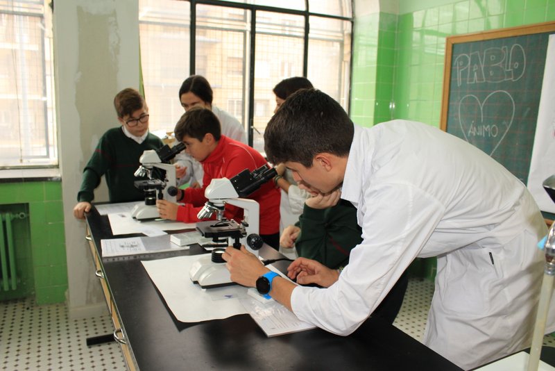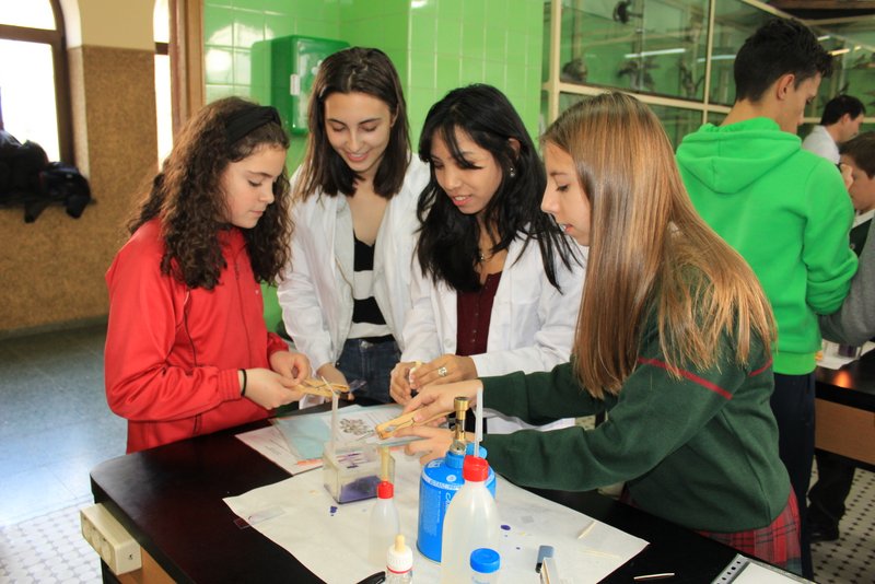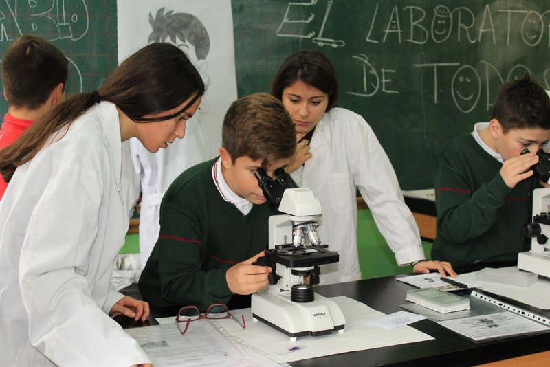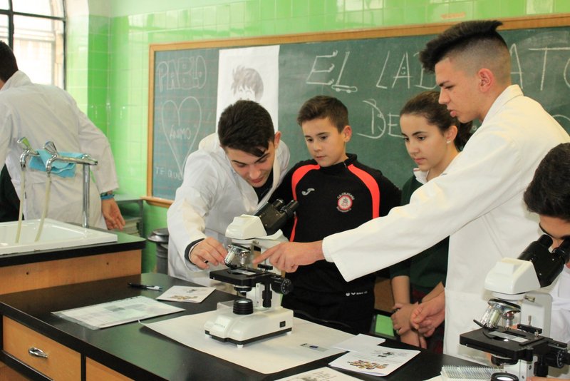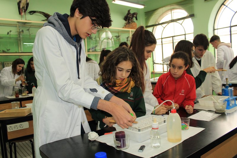 Los niños y niñas de sexto de primaria han realizado sus primeros pasos en el laboratorio de física con unos profesores excelentes: nuestros alumnos de 2º Bachillerato. Aquellos que aprendieron con nosotros en la ESO, y que hoy es un orgullo que sean los tutores de sus compañeros de sexto de primaria.