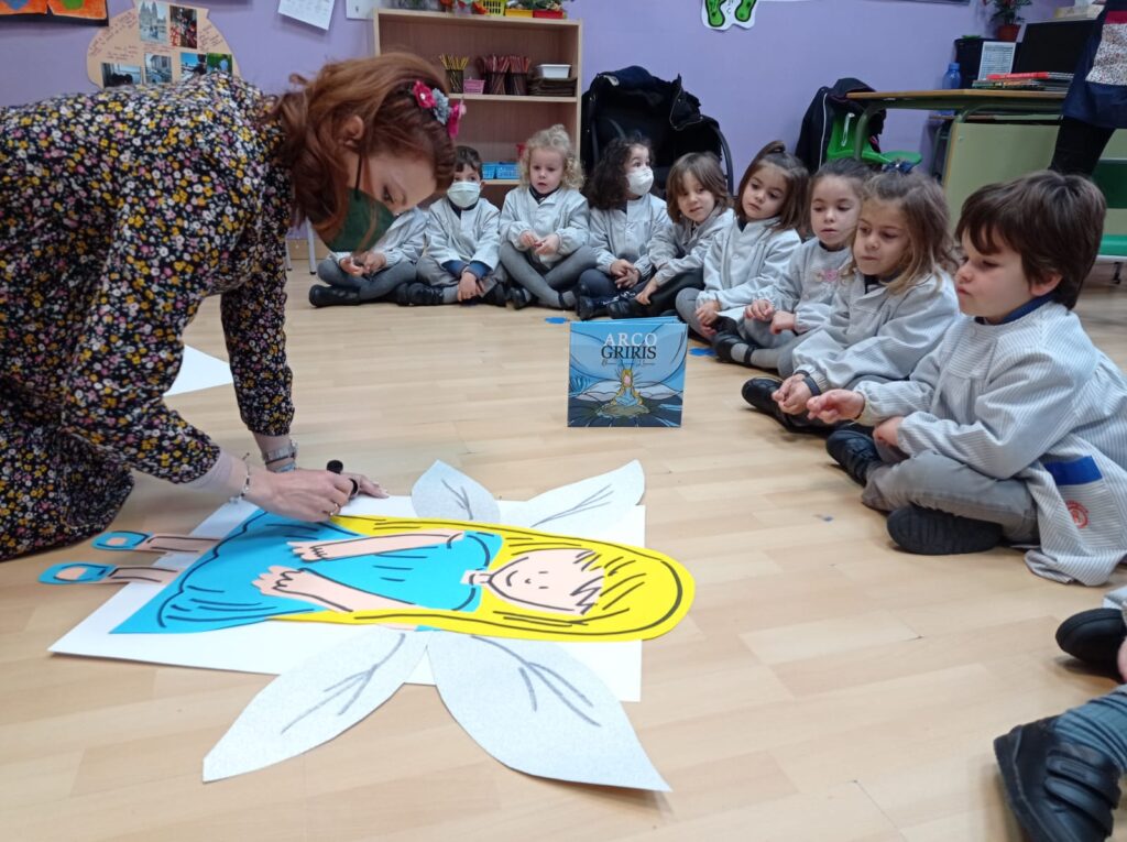 Los niños y niñas se han quedado asombrados con la rapidez de Blanca a la hora de dibujar y su gran dulzura al contar los secretos que guarda el cuento. Trazo a trazo ha narrado la historia y les ha explicado cómo las hadas y duendes de Arcogriris llenan el mundo de color y esperanza.