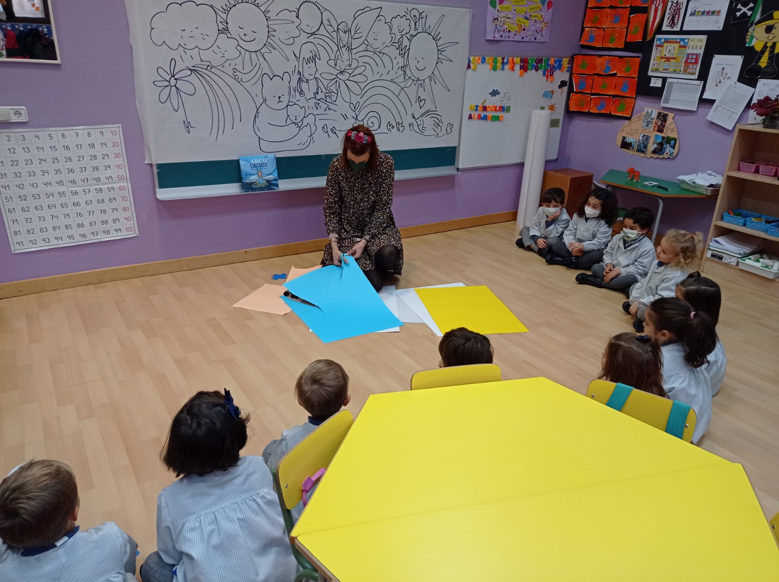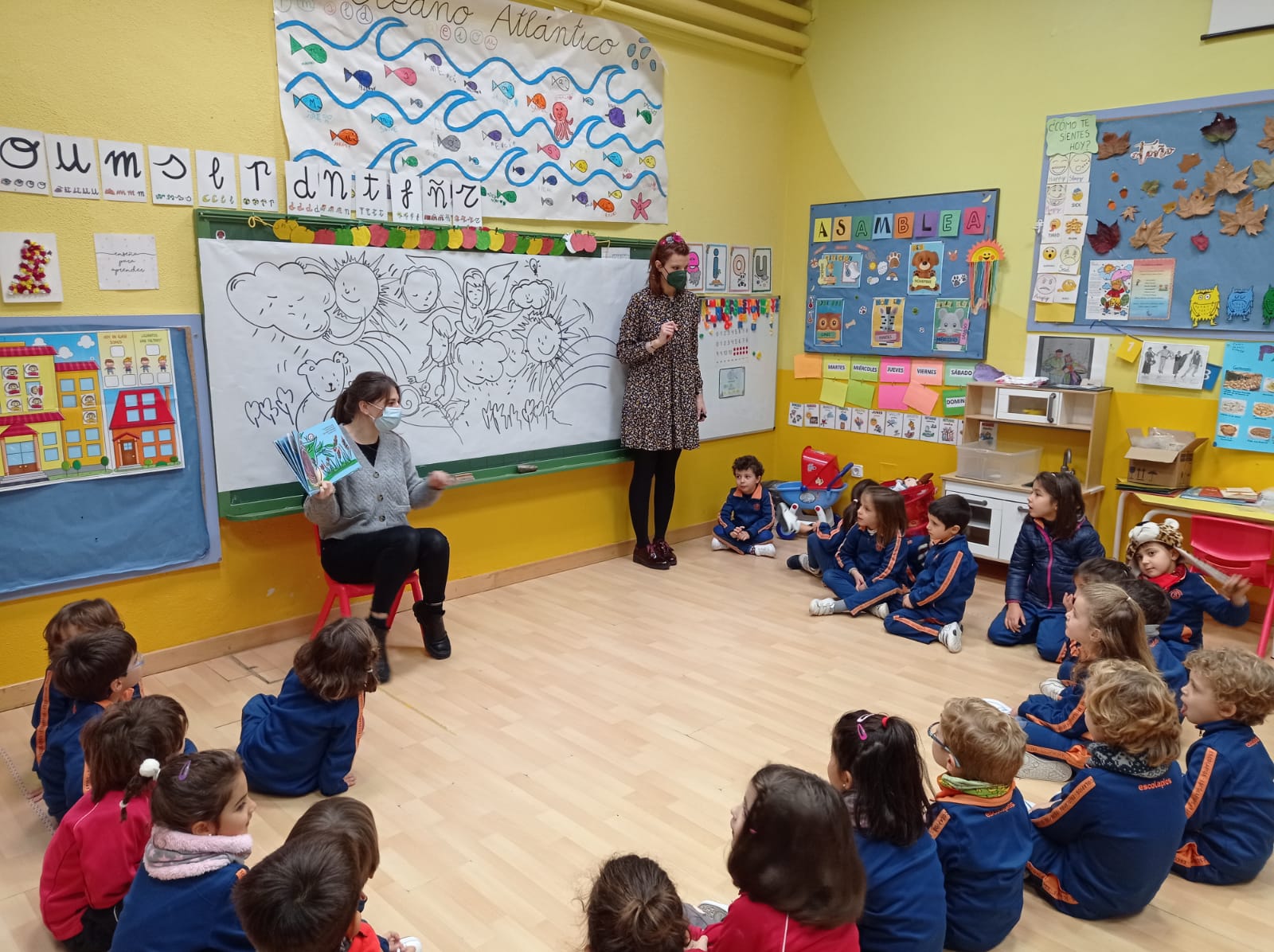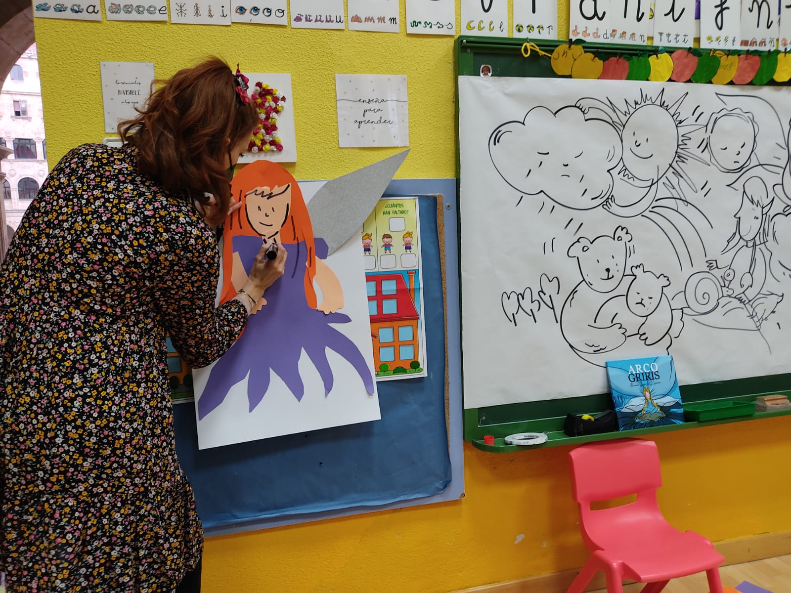 La ilustradora Blanca Lorena Llorens ha llenado las clases de 3º infantil de duendes, hadas y de pequeños animalillos que están tristes bajo un cielo gris.
