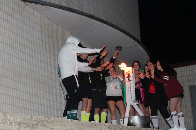 Tras cenar unas riquísimas pizzas y guiados por la antorcha olímpica, fuimos todos juntos hasta el pabellón, donde hicimos una divertida gymkhana en la que tuvimos que superar todo tipo de pruebas.