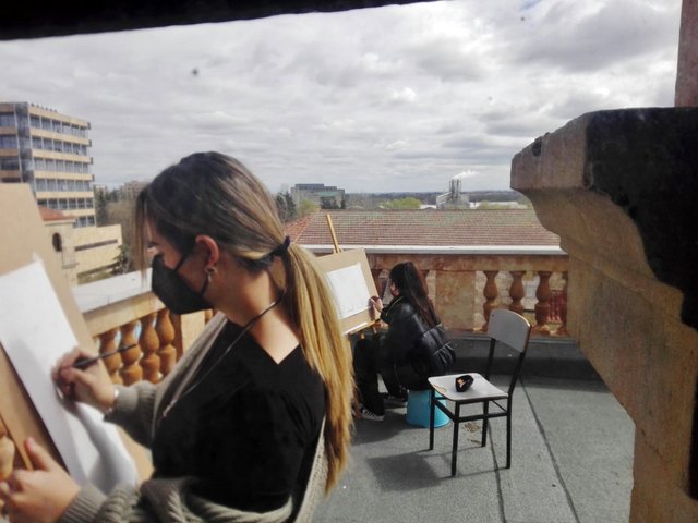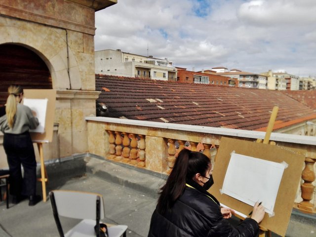 El paisaje urbano será uno de los platos fuertes hasta final de curso y, para que las alumnas comiencen a ejercitarse, la clase se ha llevado a la terraza alta del colegio.