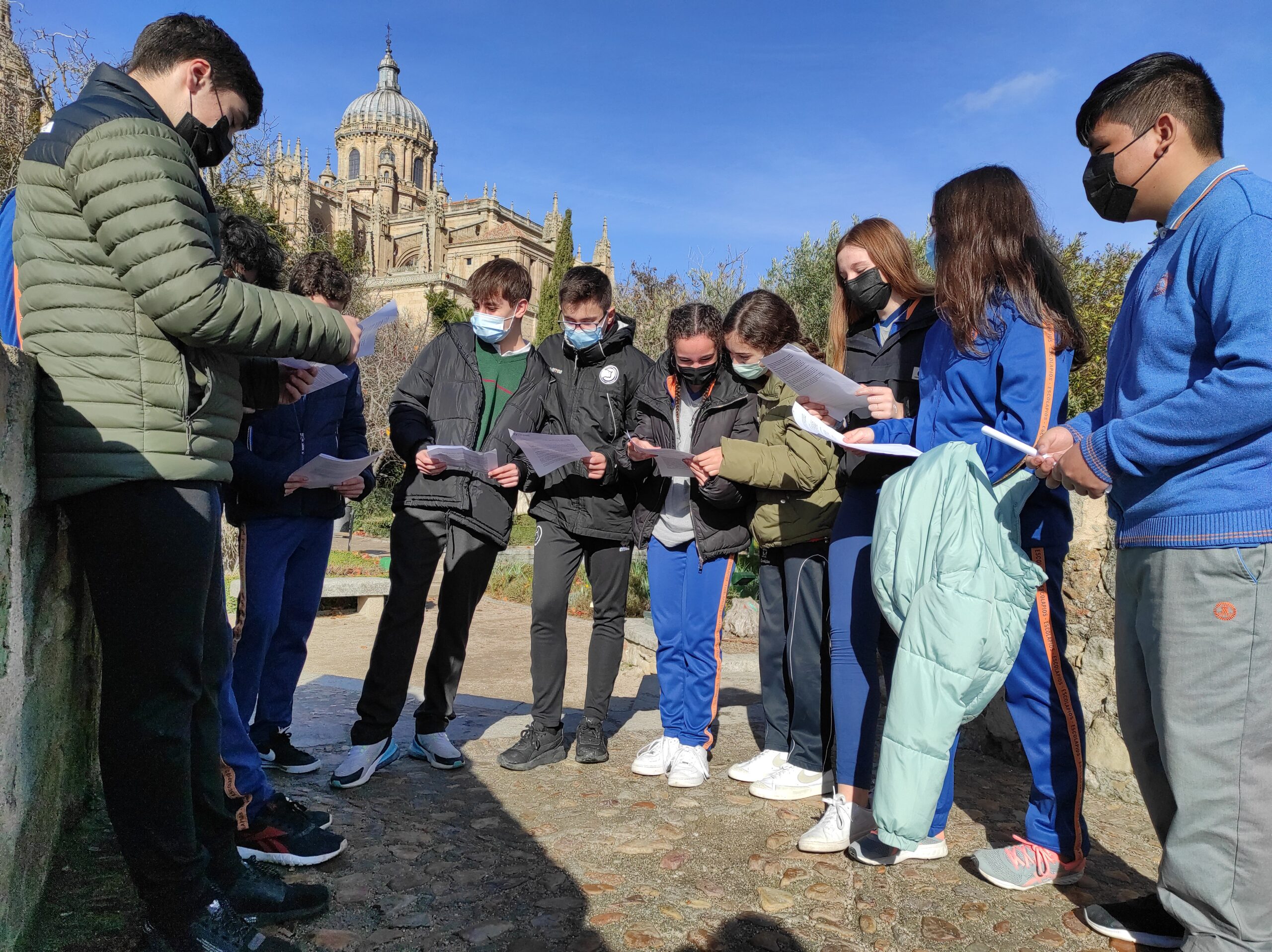 Durante el primer trimestre, los alumnos de 3º de la ESO han estudiado la literatura medieval. La Celestina es una de las obras más destacadas de nuestra literatura, pues con ella se cierra la Edad Media y se entra de lleno en la época renacentista. Y, según la tradición, el escenario de los desencuentros y encuentros amorosos entre Calisto y Melibea, con las intrigas de Celestina, Pármeno y Sempronio de por medio, fue la ciudad de Salamanca. Por ello, el Huerto de Calisto y Melibea es el lugar por excelencia para acercarse a esta obra cumbre de nuestra literatura. Hasta allí se desplazaron los alumnos de 3º A ESO, para acercarse a esta obra en el escenario que pudieron transcurrir los hechos, meterse en el papel de los protagonistas de esta comedia humanística e interpretar a sus personajes con una lectura dramatizada de los pasajes que en teoría transcurrieron en este lugar.