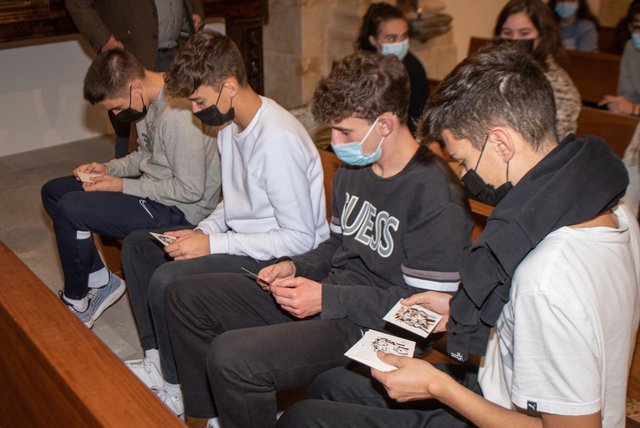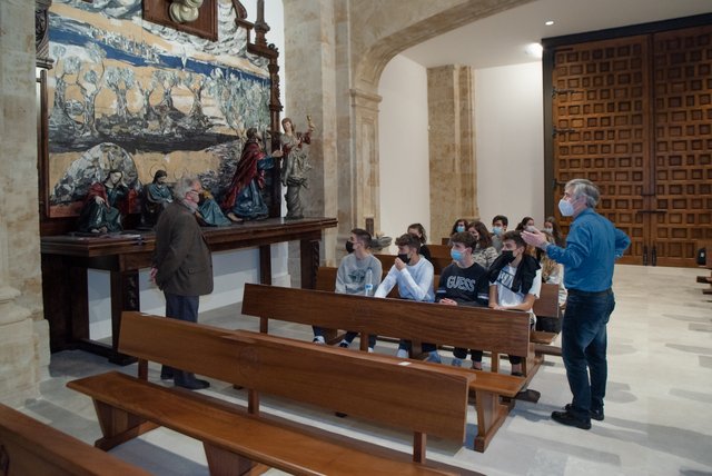 Conocer al creador resulta fundamental para la comprensión de su obra. Por esta razón, un grupo de alumnos de 2º de Bachillerato, estudiantes de Historia y Fundamentos del Arte, se desplazaron hasta la iglesia del Carmen, capilla de la VOT en el antiguo convento de San Andrés, para estudiar una obra de arte religioso actual, el retablo de la Oración del huerto, realizado mediante la técnica del collage por el pintor salmantino Andrés Alén, antiguo alumno del Calasanz.
