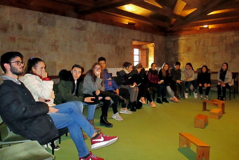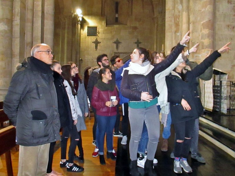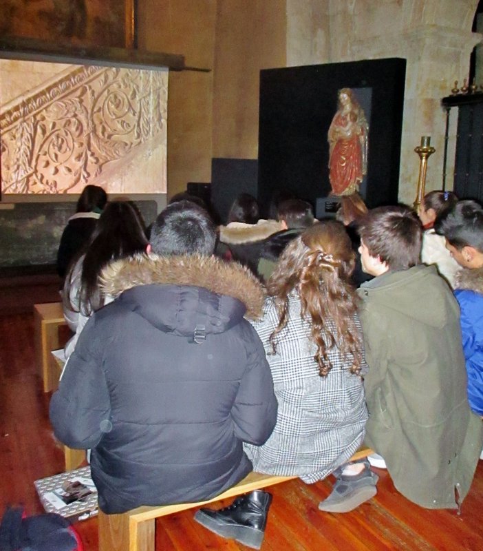Los alumnos comenzaron la visita viendo el documental sobre la iglesia realizado por el grupo diocesano Arte y Fe, en el que se explican los distintos elementos artísticos y su simbolismo de manera secuenciada, abordando cronológicamente los distintos momentos de construcción en intervención en la iglesia. Después, en compañía del párroco, el antiguo alumno de Calasanz Antonio Matilla, se fueron recorriendo las capillas de los mártires de Salamanca, Nuestra Señora de las Angustias, las naves de la iglesia, prestando especialmente atención a la estructura románica de la iglesia y las soluciones góticas del segundo momento de construcción. También se dedicó un tiempo a las sepulturas, el altar mayor, con el retablo de Churriguera y el crucificado de Fernando Mayoral, y al acceso renacentista que lleva hasta el coro.