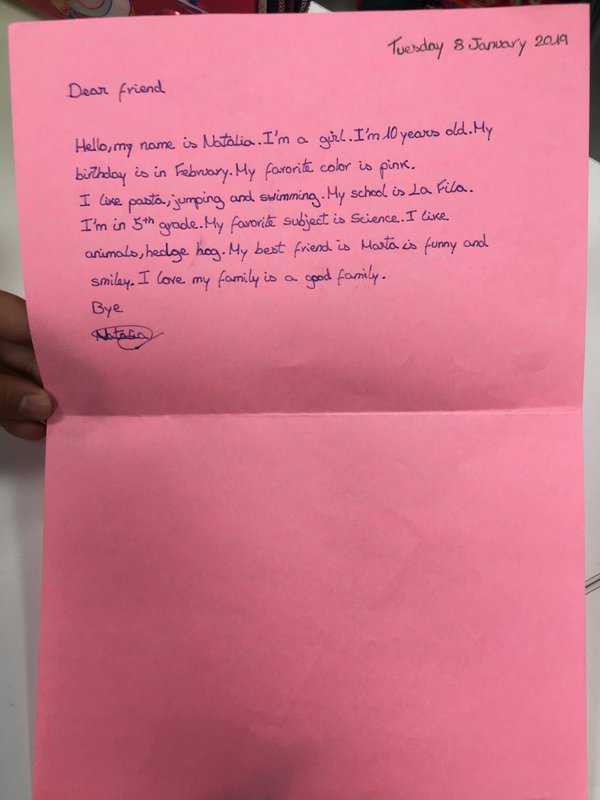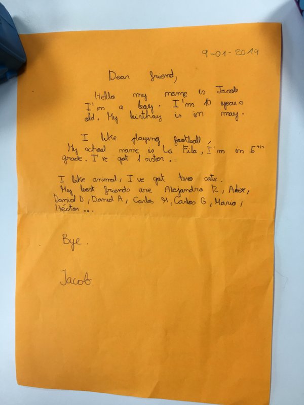 Se trata de un intercambio de cartas con alumnos de otro colegio, en concreto con un colegio de la provincia de Valencia. La semana pasada enviamos nuestras cartas y hoy han recibido con alegría y nervios las suyas. Las han leído y han completado un cuestionario para conocer y tener más información su nuevo amigo por correspondencia.