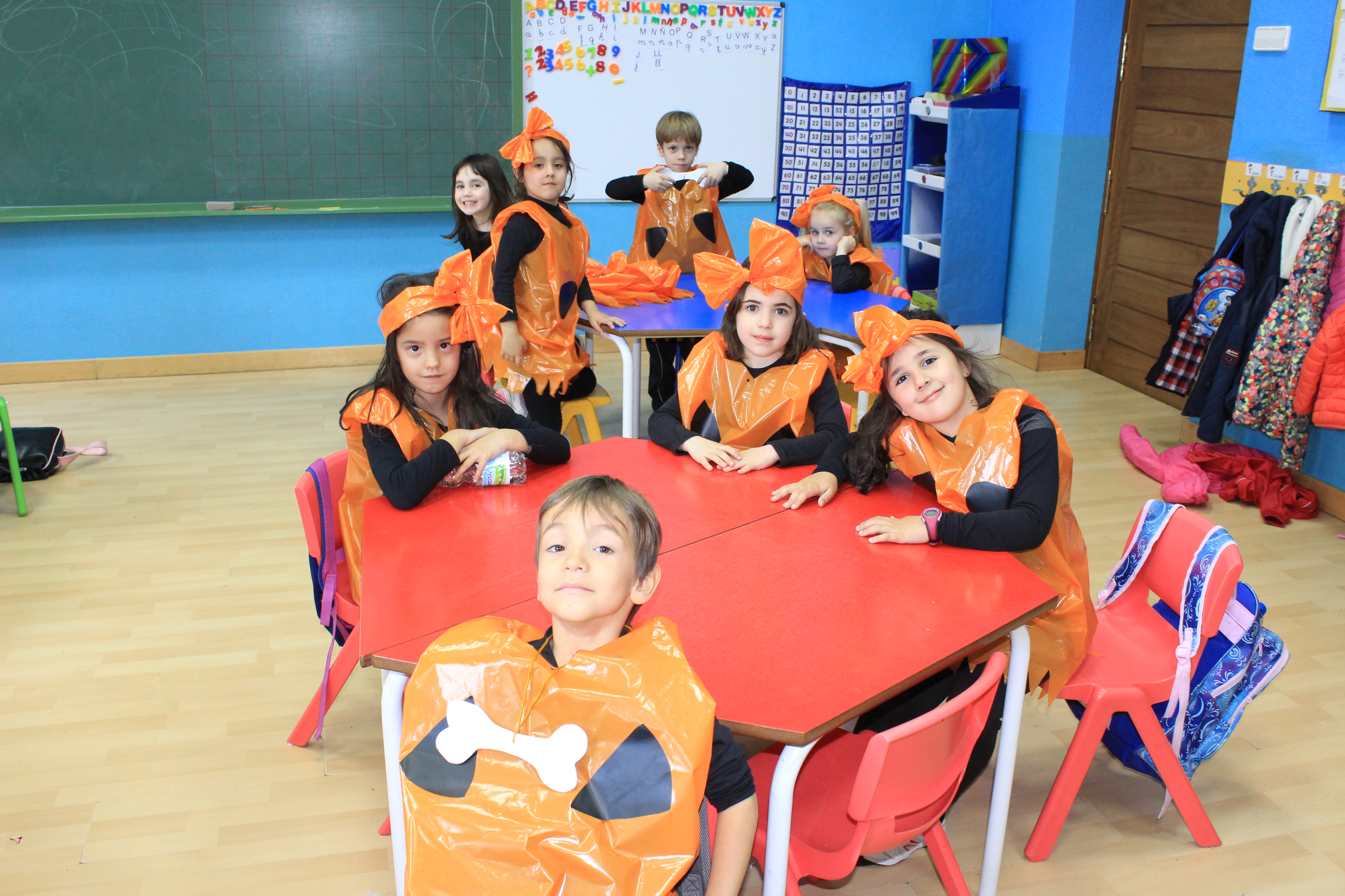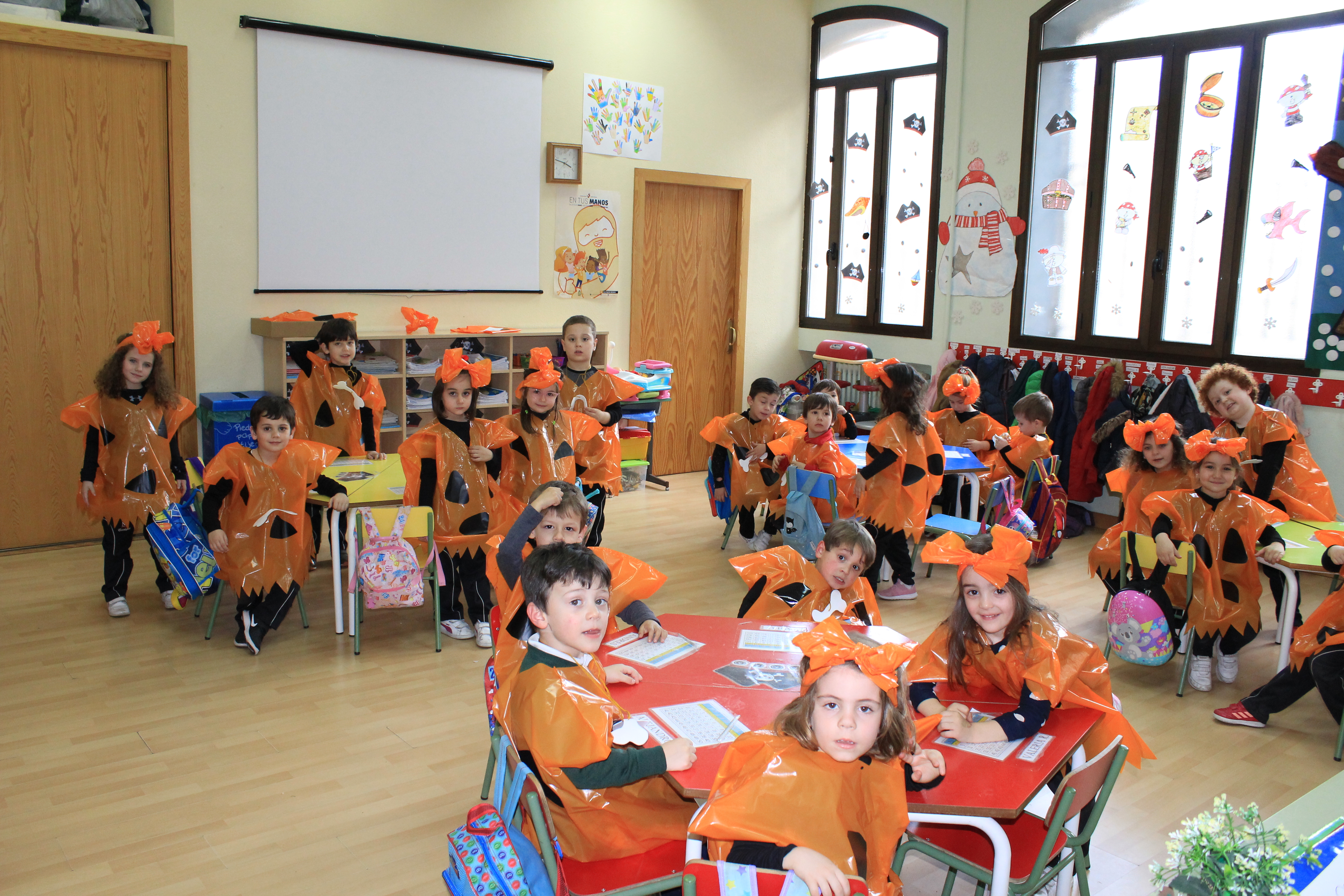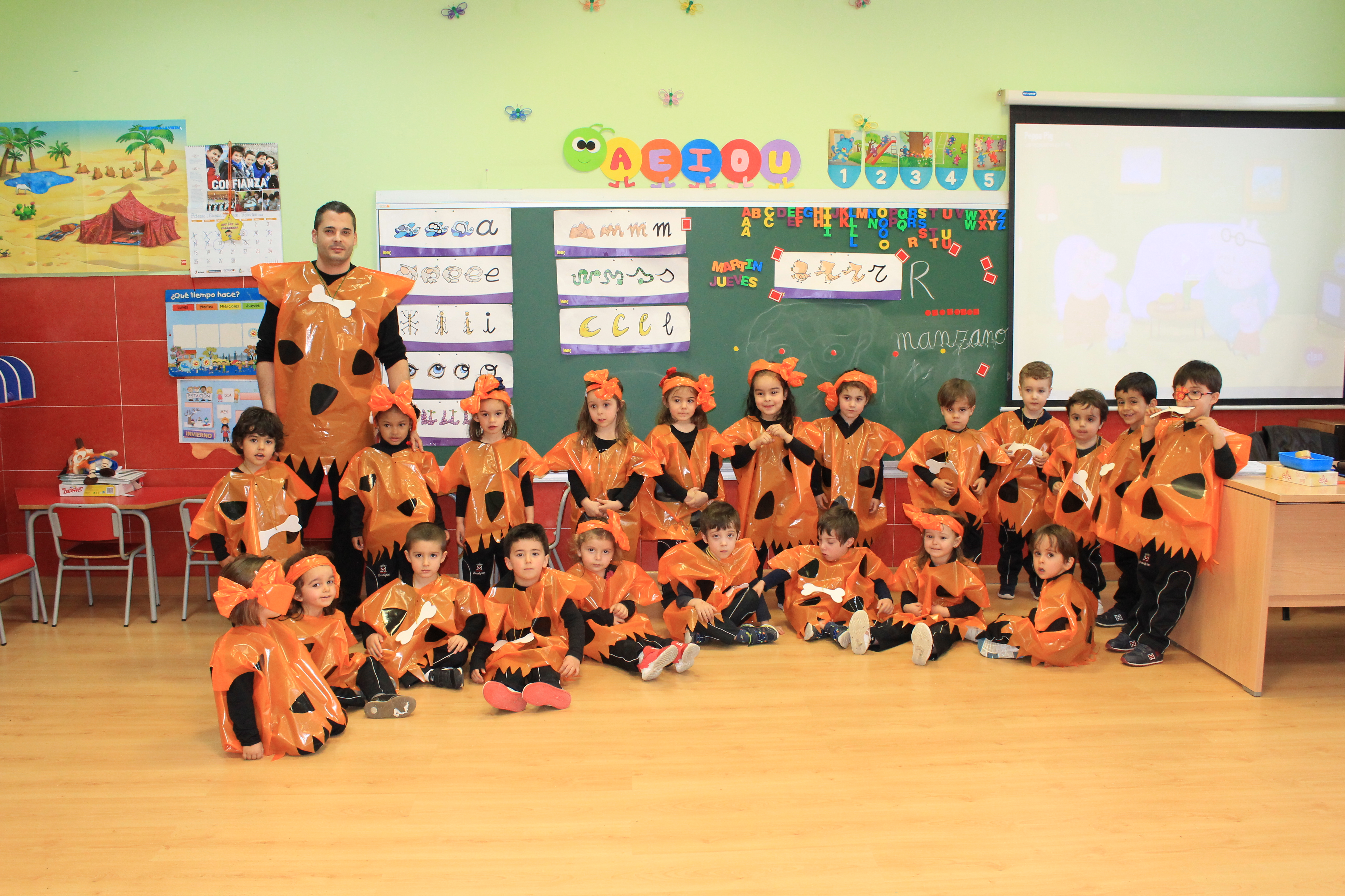 Las niñas y niños de la etapa de infantil han bailado y cantado temas relacionados con el disfraz de cavernícolas. A su vez todos los niños/as de Centro Infantil (1año y 2 años) también se han disfrazado de los alegres protagonistas de los libros que utilizan para realizar sus actividades.