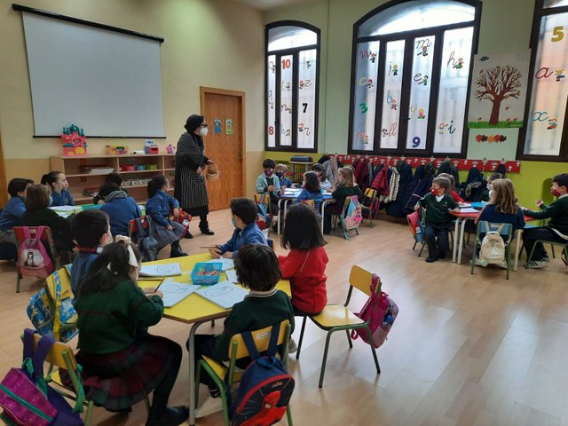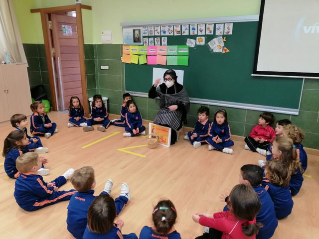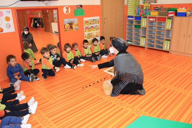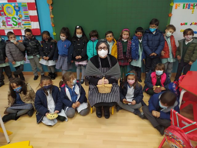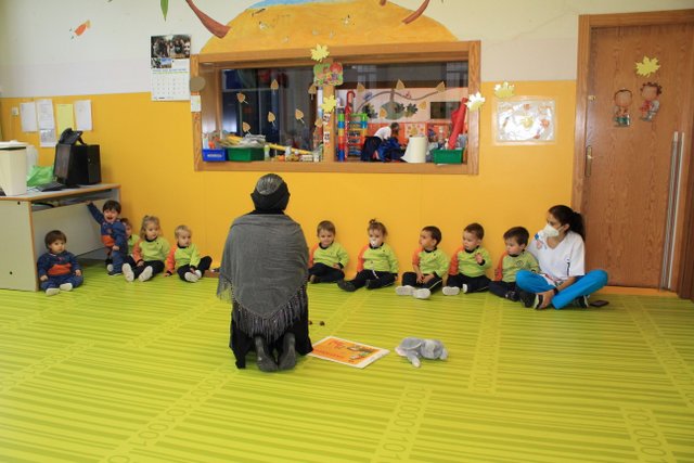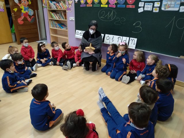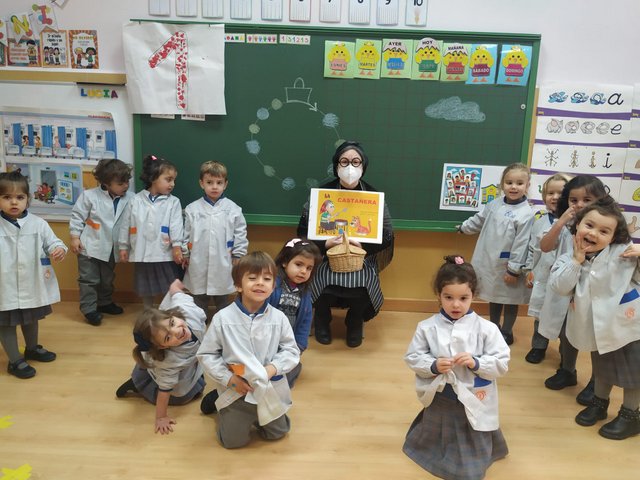 Un año más, la Castañera, aula por aula, ha recorrido todo infantil explicando a los niños y niñas cómo con ayuda de su amigo el Gigante recoge y asa las castañas.