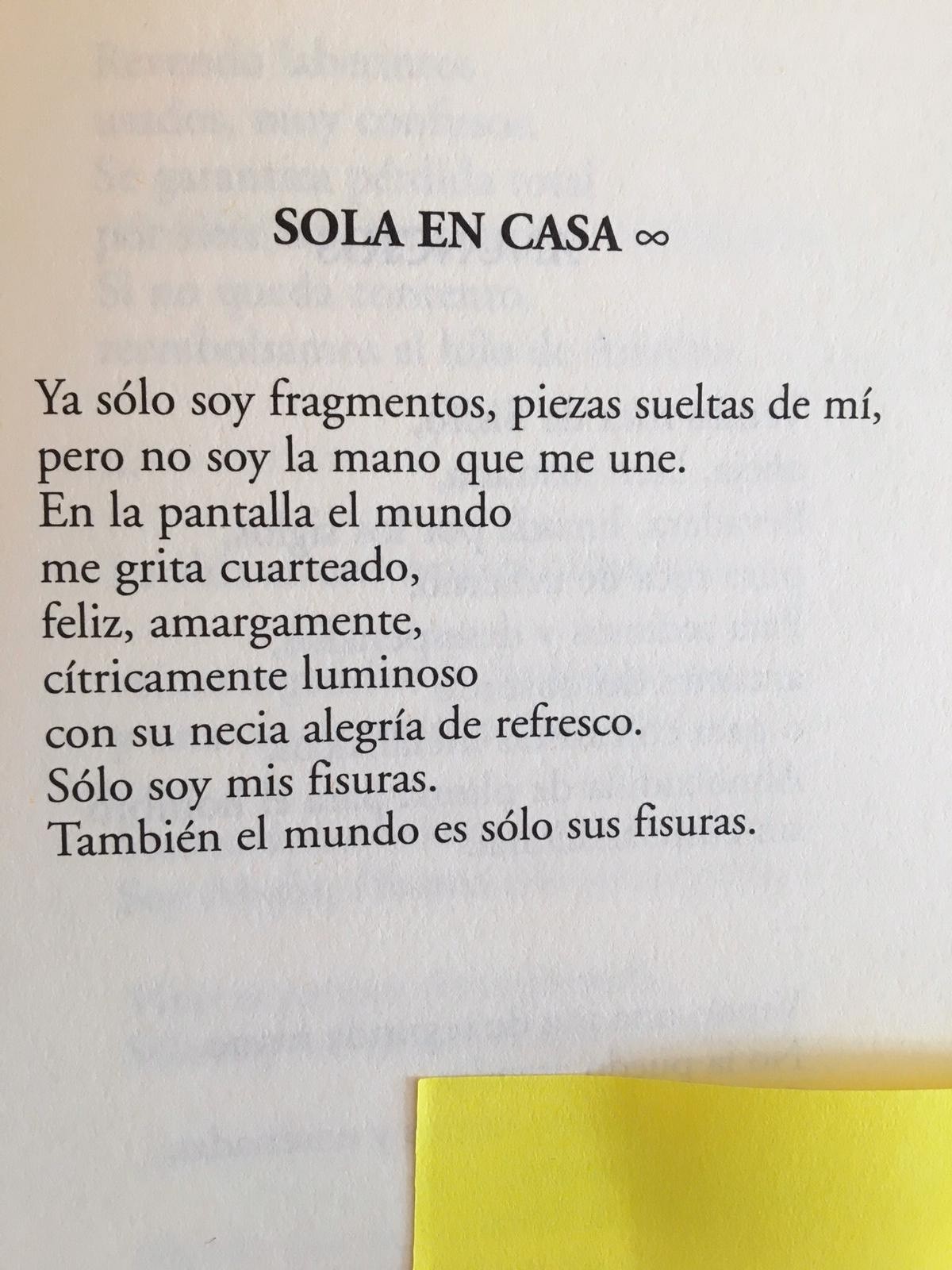Ya sólo soy fragmentos, piezas sueltas de mí,pero no soy la mano que me une.En la pantalla el mundome grita cuarteado,feliz, amargamente,cítricamente luminosocon su necia alegría ...