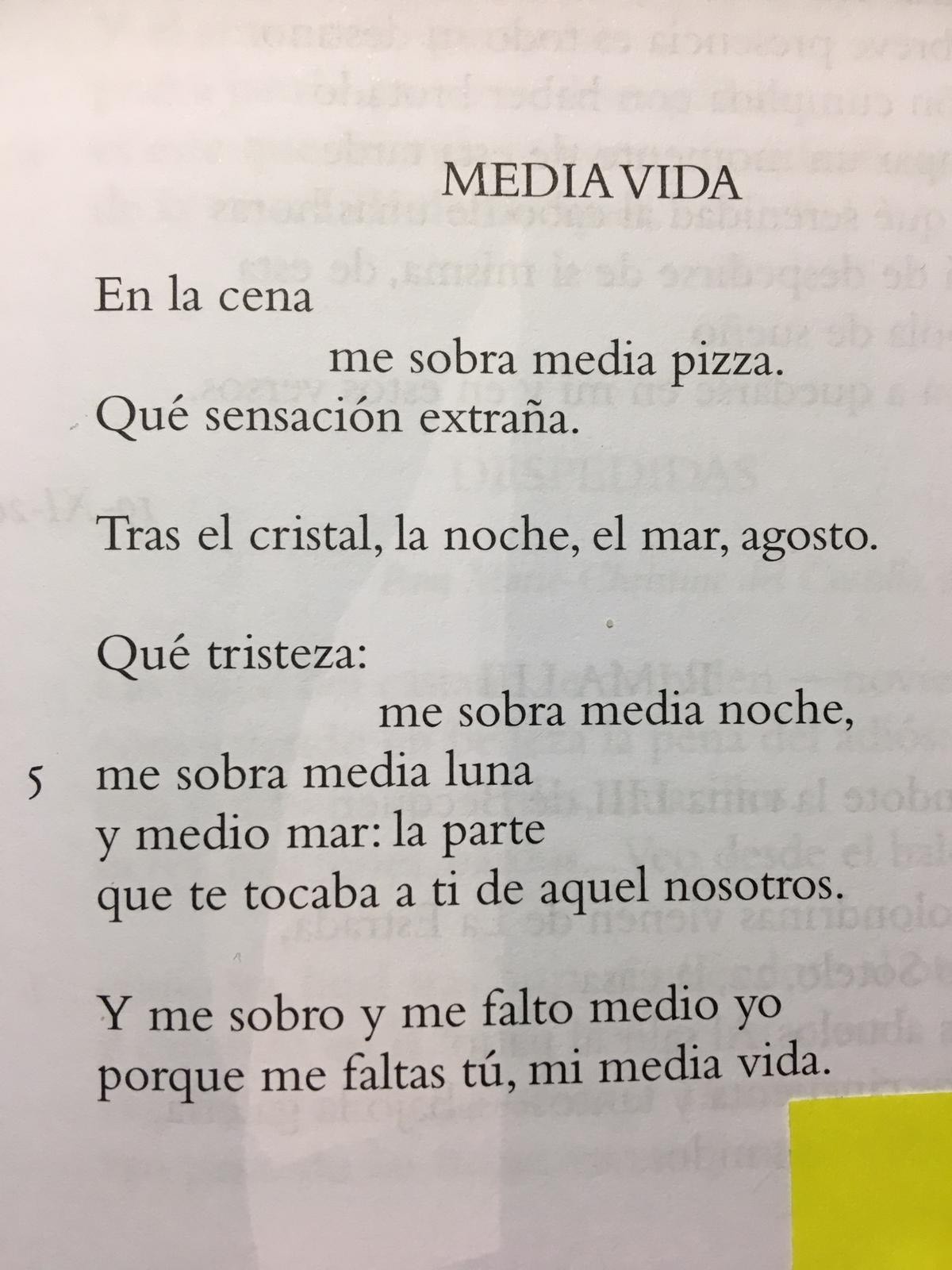 En la cename sobra media pizza.Qué sensación extraña. Tras el cristal, la noche, el mar, agosto. Qué tristeza:me sobra media noche,me sobra media lunay medio mar: la partequ...