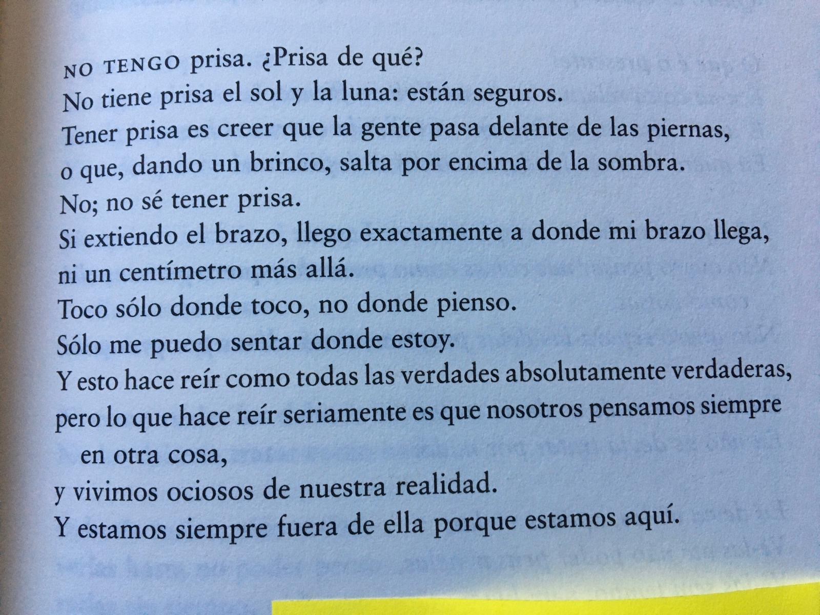 No tengo prisa. ¿Prisa de qué?No tiene prisa el sol y la luna: están seguros.Tener prisa es creer que la gente pasa delante de las piernas,o que, dando un brinco, salta por encima...